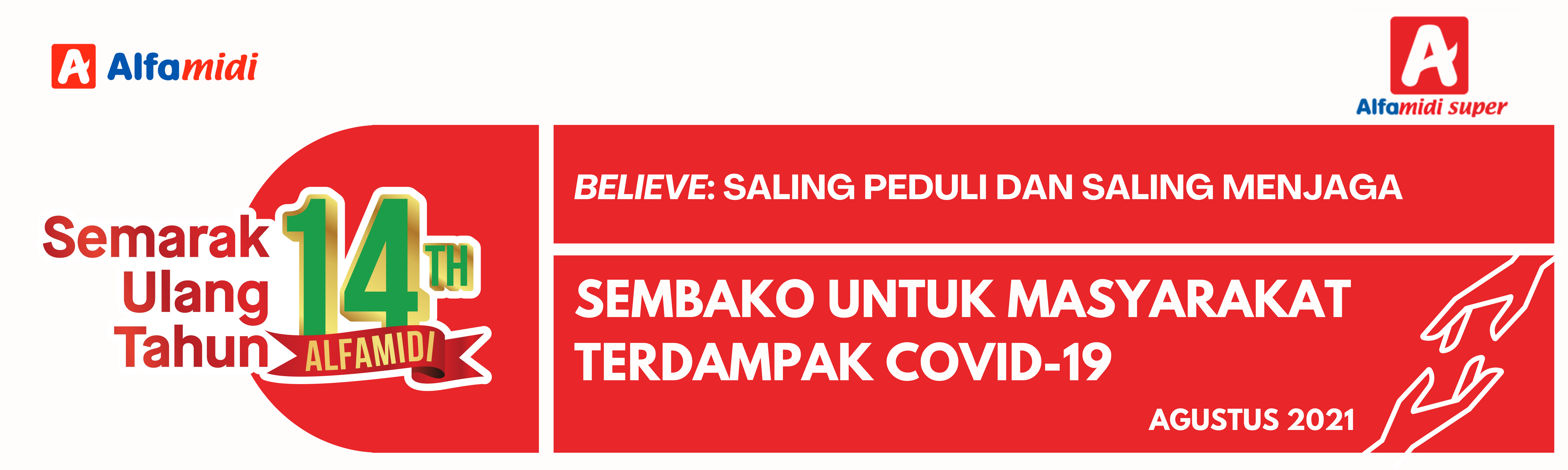 Dalam rangka memperingati hari ulang tahunnya yang ke-14, Alfamidi berbagi sembako untuk masyarakat yang membutuhkan, khususnya yang terdampak pandemi covid-19. Pembagian sembako dilakukan di seluruh Wilayah Alfamidi dengan jumlah paket yang disiapkan sebanyak 4.000. Adapun Wilayah yang dimaksud di antaranya Sumatra Utara, Banten, Jawa Barat, Yogyakarta, Jawa Timur, Kalimantan Timur, Sulawesi Selatan,